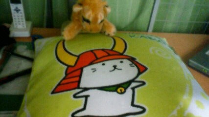 ひこにゃんのクッションと奥にいるぬいぐるみですー。